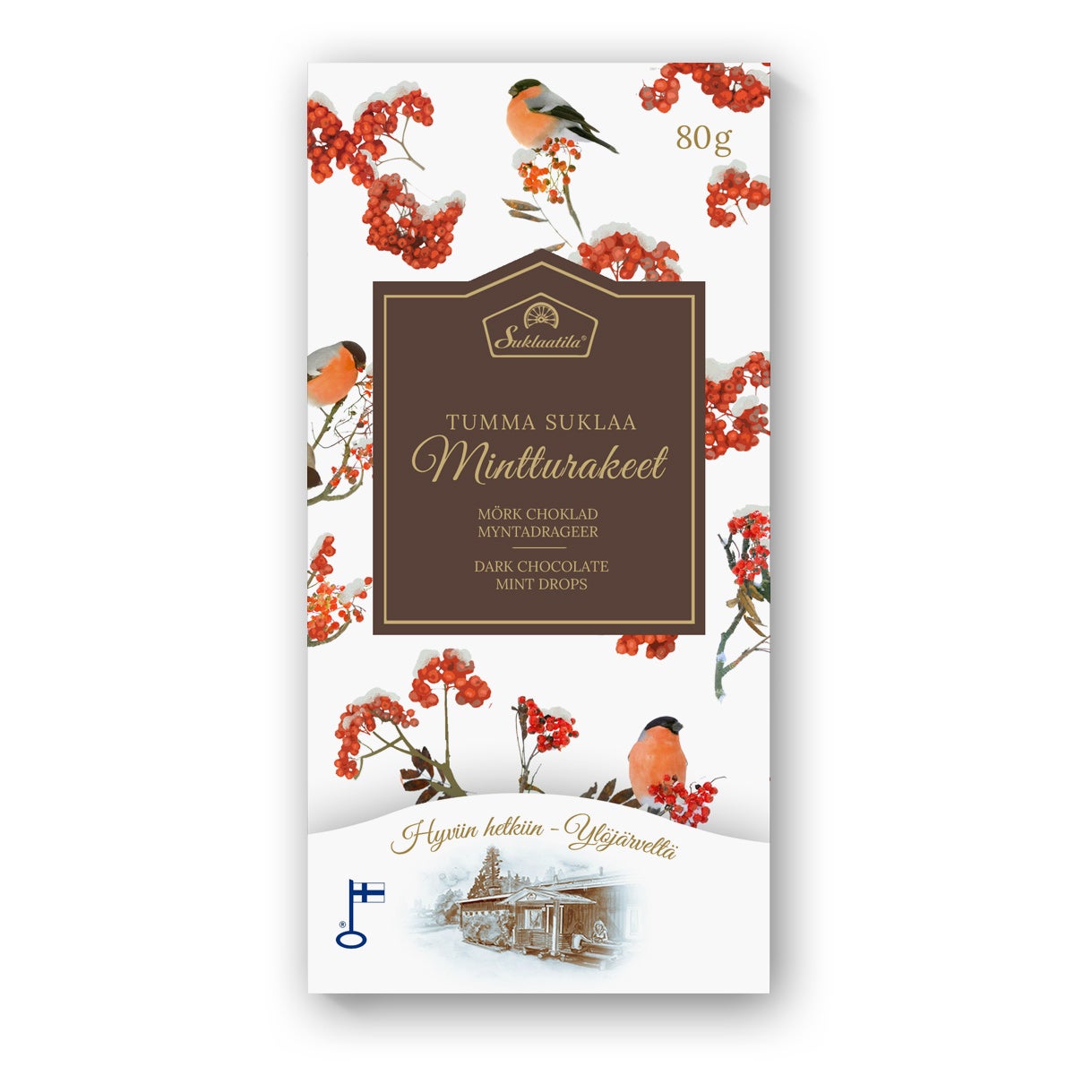 Ainekset: kaakaomassa, sokeri, mintturae (10%) (sokeri, dekstroosi, glukoosisiirappi, aromi, vähärasvainen kaakaojauhe), kaakaovoi, emulgointiaine (SOIJALESITIINI) ja aromi (vanilja). Saattaa sisältää maidon ja pähkinän jäämiä. Suklaan kaakaopitoisuus vähintään 55 %. Kaakaon alkuperämaa muu kuin EU. Säilytys 12–20 ⁰C. Ingredienser: kakaomassa, socker, myntadrageer (10%) (socker, dextros, glukossirap, arom, låg fetthalt kakaopulver), kakaosmör, emulgeringsmedel (SOJALECITIN) och arom (vanilj). Kan innehålla spår av mjölk och nötter. Kakao i choklad minst 55 %. Kakaos ursprungsland inte EU. Förvaring 12–20 ⁰C. Ingredients: cocoa mass, sugar, mint drops (10%) (sugar, dextrose, glucose syrup, flavor, low-fat cocoa powder), cocoa butter, emulsifier (SOYA LECITHIN) and aroma (vanilla). May contain traces of milk and nuts. Cocoa content minimum 55%. Cocoas country of origin other than EU. Store at 12–20 ⁰C.