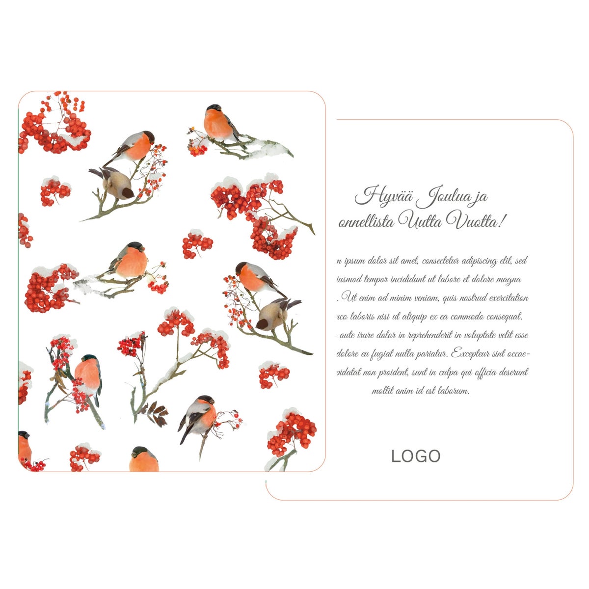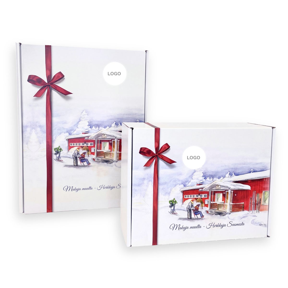 Käytämme valmista joulukorttipohjaamme. Halutessasi voit käyttää saatekortin kannessa myös omaa valmista painoaineistoasi. Kortti on malliltaan taittokortti, ja joulutervehdysteksti logoineen tulee kortin sisäsivulle. Kortti sijoitetaan lahjarasian sisään.