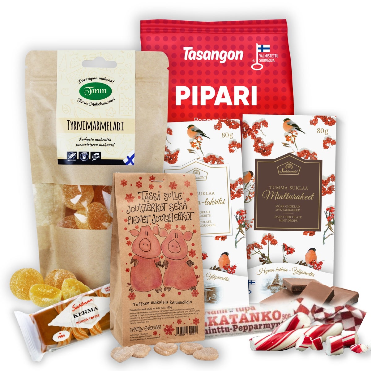 Pikkumakeat-lahjasetti sisältää seuraavat kotimaiset herkut: